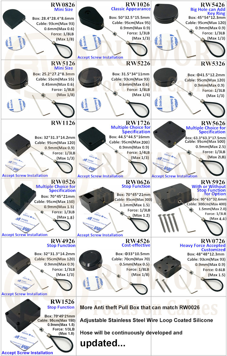 RW0826 D-shaped Small Retractable Tether Plus Adjustable Stainless Steel Wire Loop Coated Silicone Hose RW1026 Drop-shaped Retractable Security Tether Plus Adjustable Stainless Steel Wire Loop Coated Silicone Hose RW5426 Heart-shaped Security Pull Box Plus Adjustable Stainless Steel Wire Loop Coated Silicone Hose RW5126 Round Mini Anti Lost Recoiler Plus Adjustable Stainless Steel Wire Loop Coated Silicone Hose RW5226 Round Anti Theft Retractor Plus Adjustable Stainless Steel Wire Loop Coated Silicone Hose RW5326 Round Security Display Tether Plus Adjustable Stainless Steel Wire Loop Coated Silicone Hose RW1126 Square Retail Security Tether Plus Adjustable Stainless Steel Wire Loop Clad Silicone Hose for Product Positioning RW1726 Square Security Tether Plus Adjustable Stainless Steel Wire Loop Coated Silicone Hose RW5626 Square Heavy Duty Retractable Cable Plus Adjustable Stainless Steel Wire Loop Coated Silicone Hose RW0526 Cuboid Anti Theft Pull Box with Adjustalbe Stainless Steel Anti-theft Cable Loop Coated with Silicone Hose RW0626 Cuboid Ratcheting Retractable Cable Plus Ratchet Function Adjustable Stainless Steel Wire Loop Coated Silicone Hose RW5926 Cuboid Heavy Duty Retractable Tether function optional Plus Adjustable Wire Loop Coated Silicone Hose RW4926 Square Ratcheting Retractable Tether Plus Stop Function and Adjustable Wire Loop Coated Silicone Hose RW4526 Round Mini Display Pull Box Plus Adjustable Stainless Steel Wire Loop Coated Silicone Hose RW0726 Square Retractable Cable Plus Adjustable Stainless Steel Wire Loop Coated Silicone Hose RW1526 Cuboid Multifunctional Retractable Cable with Adjustalbe Stainless Steel Anti-theft Cable Loop Coated with Silicone Hose