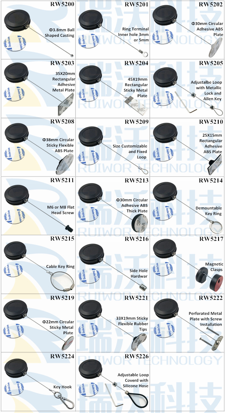 For RW5215 security tether, Box color, Cable color, Cable diameter, Cable length,Retract Pull force are can be customized.